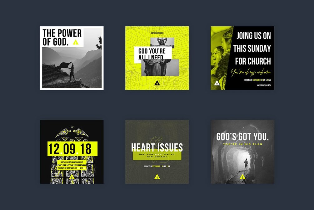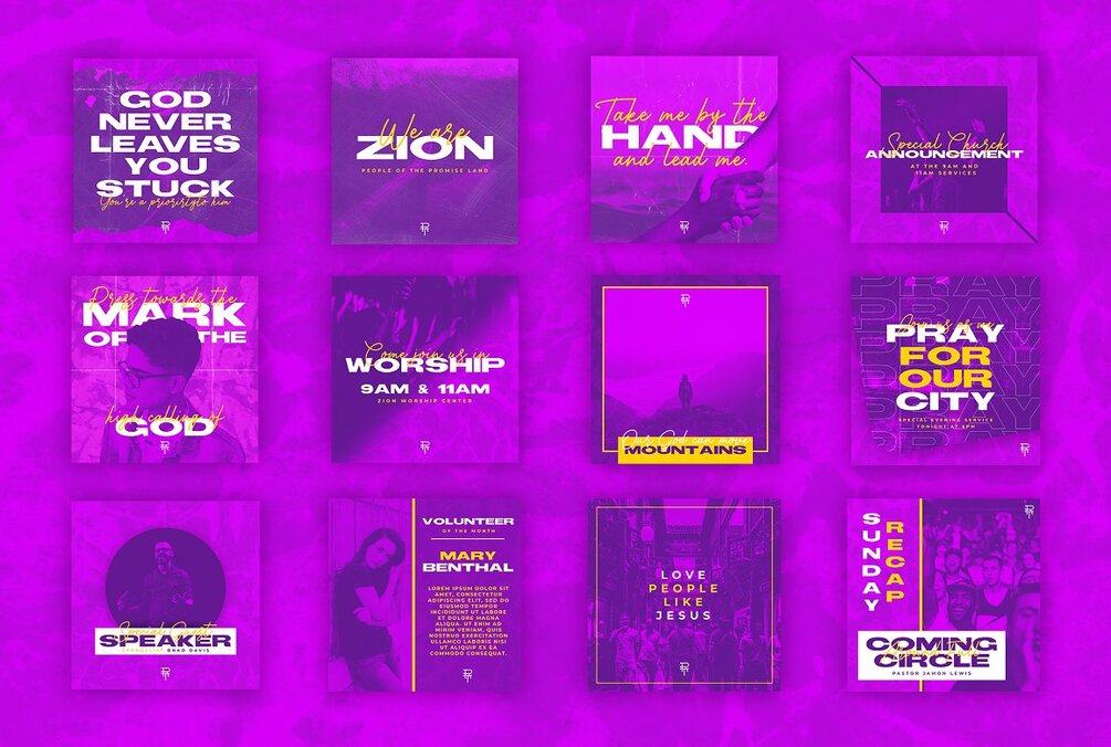 Zion Social Media Pack gives your church a style boost with its trendy and contemporary look. It is optimized for Instagram, Facebook and Pinterest but thanks to square and horizontal templates you can use it in any social media platform including blogs.