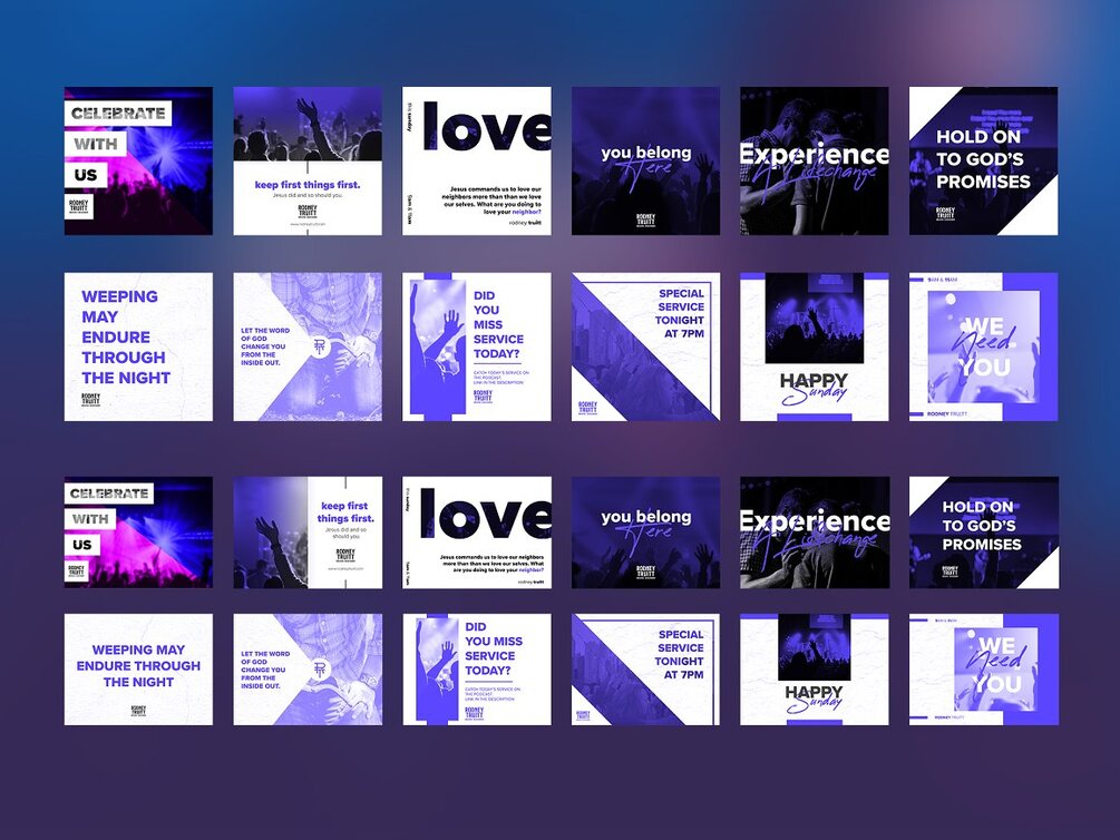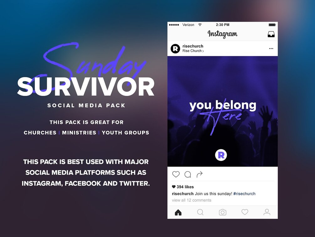 Sunday Survivor is a social media pack aimed at helping churches do what they're called to do. Reach people. Social media plays a HUGE part in setting your church/ministry apart from the other churches/ministries in your area. That's why I've created this social media pack to combat the boring and mundane social media presence to a more upbeat, lively and thriving social media experience for those who are already following your social media accounts and those who have yet to follow it. This pack contains 12 unique designs poised for the effection social media communication of the church! In this pack, you get the 12 designs in both 1x1 square aspect ratio and horizontal formats. This pack is using 2 free fonts from Adobe Typekit, Google fonts, and Font Squirrel so it's totally safe to use. This pack is great to use on major social media platforms like Instagram, Facebook, and Twitter. I hope this pack blesses you in some way as you use to it to reach people!